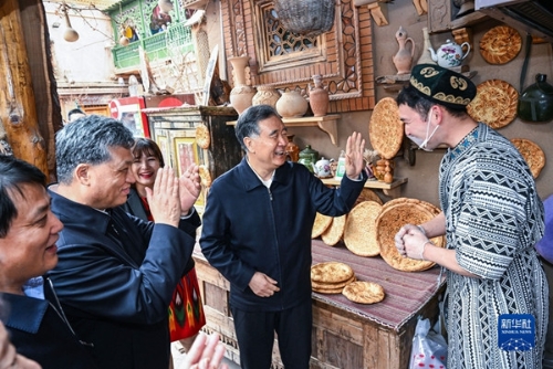 3月18日至22日,中共中央政治局常委、全国政协主席汪洋在新疆调研。这是3月20日,汪洋在喀什古城调研文旅融合促进就业情况。新华社记者 饶爱民 摄