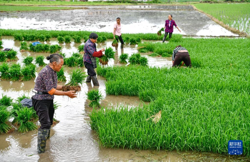 6月1日,农民在贵州省贵定县沿山镇香山村移栽水稻秧苗。