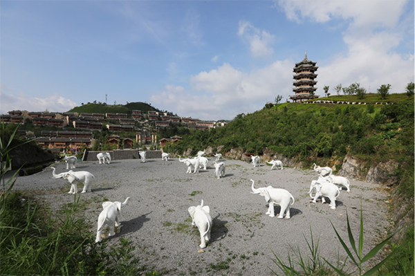 在晴隆县三宝街道办事处副主任张福丽的引导下,摄影团来到了三宝塔一览小镇全貌。三宝塔是阿妹戚托小镇的制高点,从三宝塔向远处眺望,可以看到对面展现出山地建筑独有的特色台阶式建筑布置。三宝街道的规划中充分结合民族文化元素,巧妙地将“牛头”(新塘社区)“虎头”(新宝社区)“八卦”(新坪社区)运用于建筑布图中,增加了地方少数民族文化的特色。